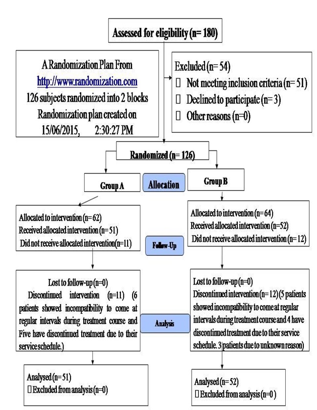 Patients with pathologies of liver, heart, kidney, lungs and other organs were excluded from the study. Poorly controlled hypertension (≥200/120mm Hg), uncontrolled diabetes mellitus type II (Fasting blood sugar>250mg/dl), impaired renal function (serum creatinine ≥1.2 mg/dl), pregnancy and lactation were also excluded from study.