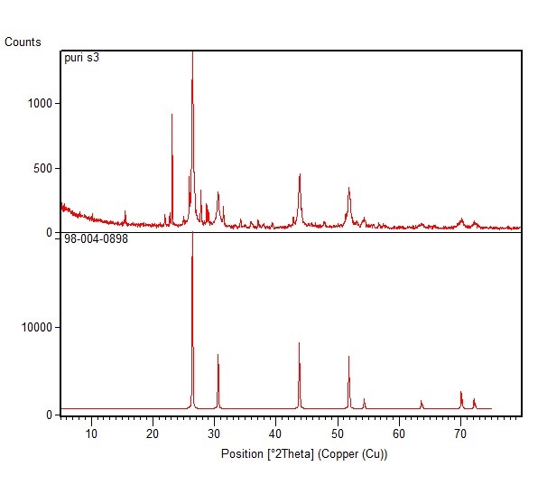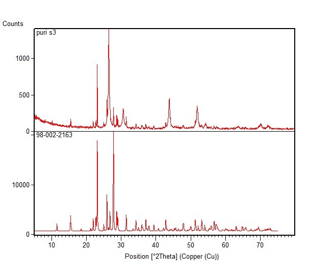 XRD pattern of Rasaparpati shows HgS (metacinnabar) in cubic form along with free sulphur in orthorhombic form. No other peaks were found, thus strengthening the fact that the Rasaparpati was processed correctly. The XRD pattern confirms that the prepared Rasaparpati resemble the characteristic of compound HgS.