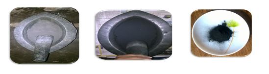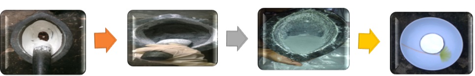 Parada(500gms) and Sudha(500gms)(lime) were taken in a Khalva Yantra and triturated continuously for 8 days i.e. 3 hrs /day approximately. When the trituration was over, mixture of Parada and lime was washed with hot water repeatedly to obtained Parada [Fig – 1 (a)]. Mercury collected from above step, dehusked garlic (250gms) & Saindhava Lavana (500gms) were taken in the Khalwa Yantra and triturated well till the Kalka turns in to Krishna Varna. After complete trituration, the paste was washed with luke warm water and shiny, clean and clear Parada (400gms) was collected [Fig – 1 (b)] .