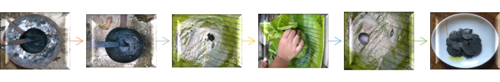 100gms of Kajjali was taken for preparation of Rasaparpati. Kajjali was put in an Iron ladle which was smeared with required quantity of Goghrita and heated with mild fire directly on the Angarakosthi. When melting started it is stirred gently and heating continued till Kajjali became paste like. Iron ladle was then taken out from the fire and immediately the paste was poured on the banana leaf placed over the cow dung platform and pressed by another banana leaf containing cow dung Pottali with downward and forward force. After cooling the flakes formed were collected i. e. the Rasaparpati (85gms) (Fig- 4).