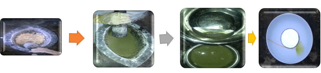 During preparation of Kajjali, at first the colour of the mixture is yellowish black, rough in touch and gradually after several hours of trituration, the colour became blackish and smooth. Finally the colour turned to black like collyrium, the texture became smooth and lustureless.