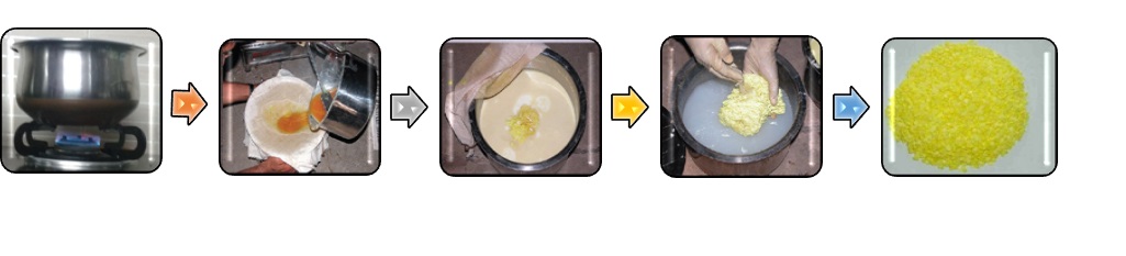 The powdered Gandhaka (650gms) was taken in a Loha darvi, smeared with Goghrita (150ml) and then subjected to heat on mild fire and was stirred with spoon gently. When Gandhaka melted completely, it was poured in to cow’s milk (2.6ltrs) containing vessel which was covered with a clean cloth piece and shaking the container continuously. The Gandhaka (630gms) collected at the bottom of vessel containing cow’s milk was collected and washed thoroughly with lukewarm water.(Fig- 2)
